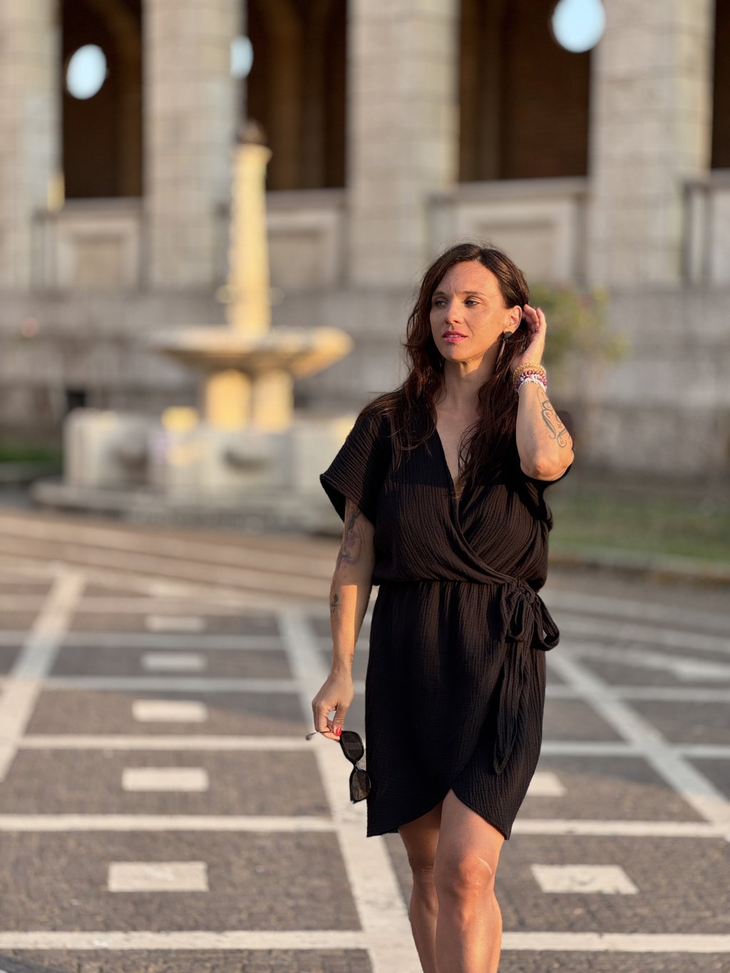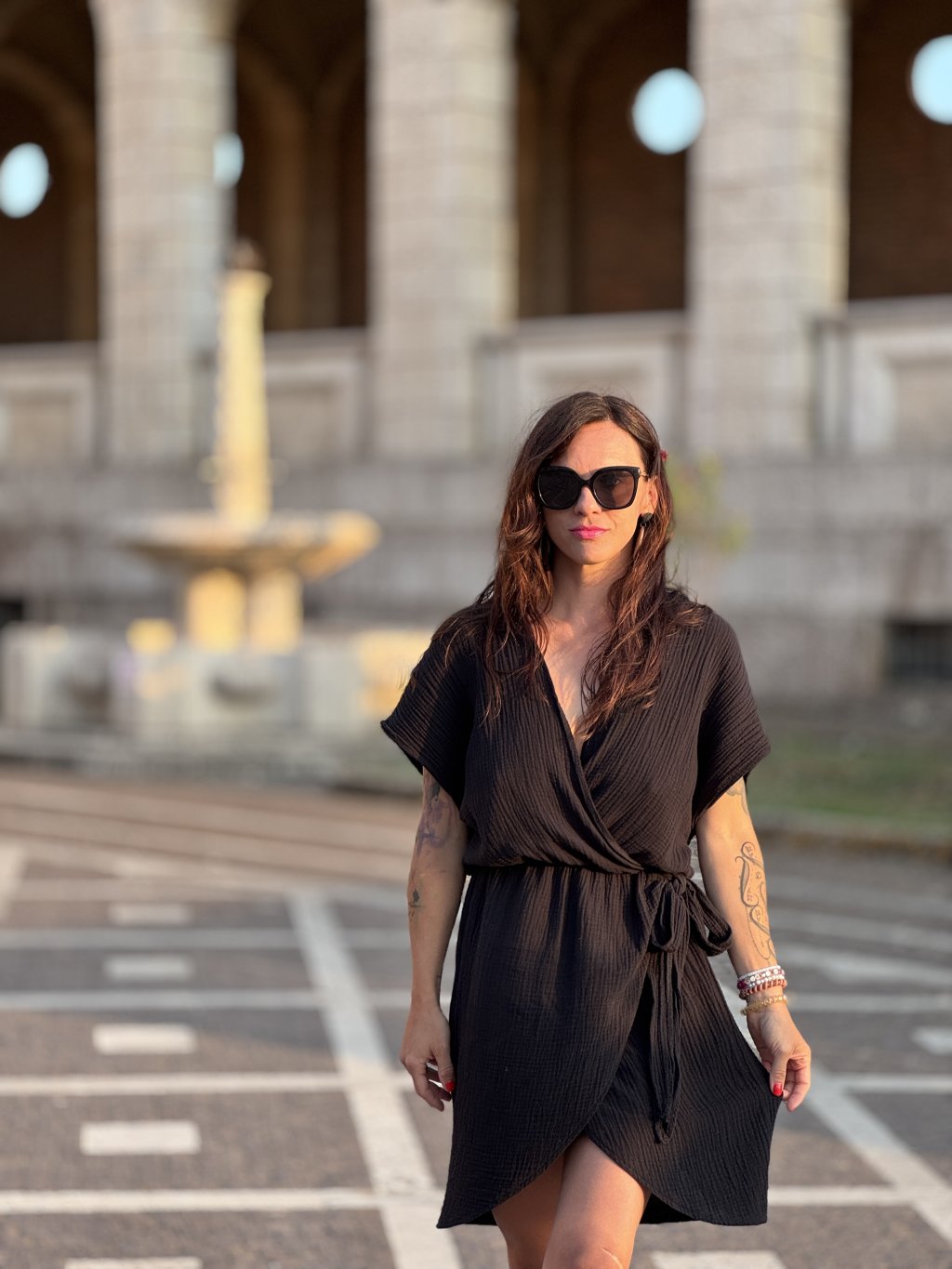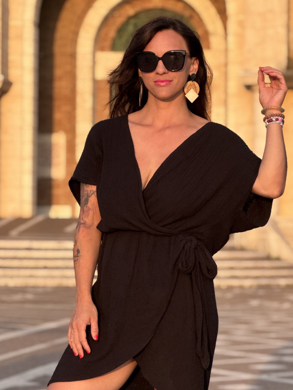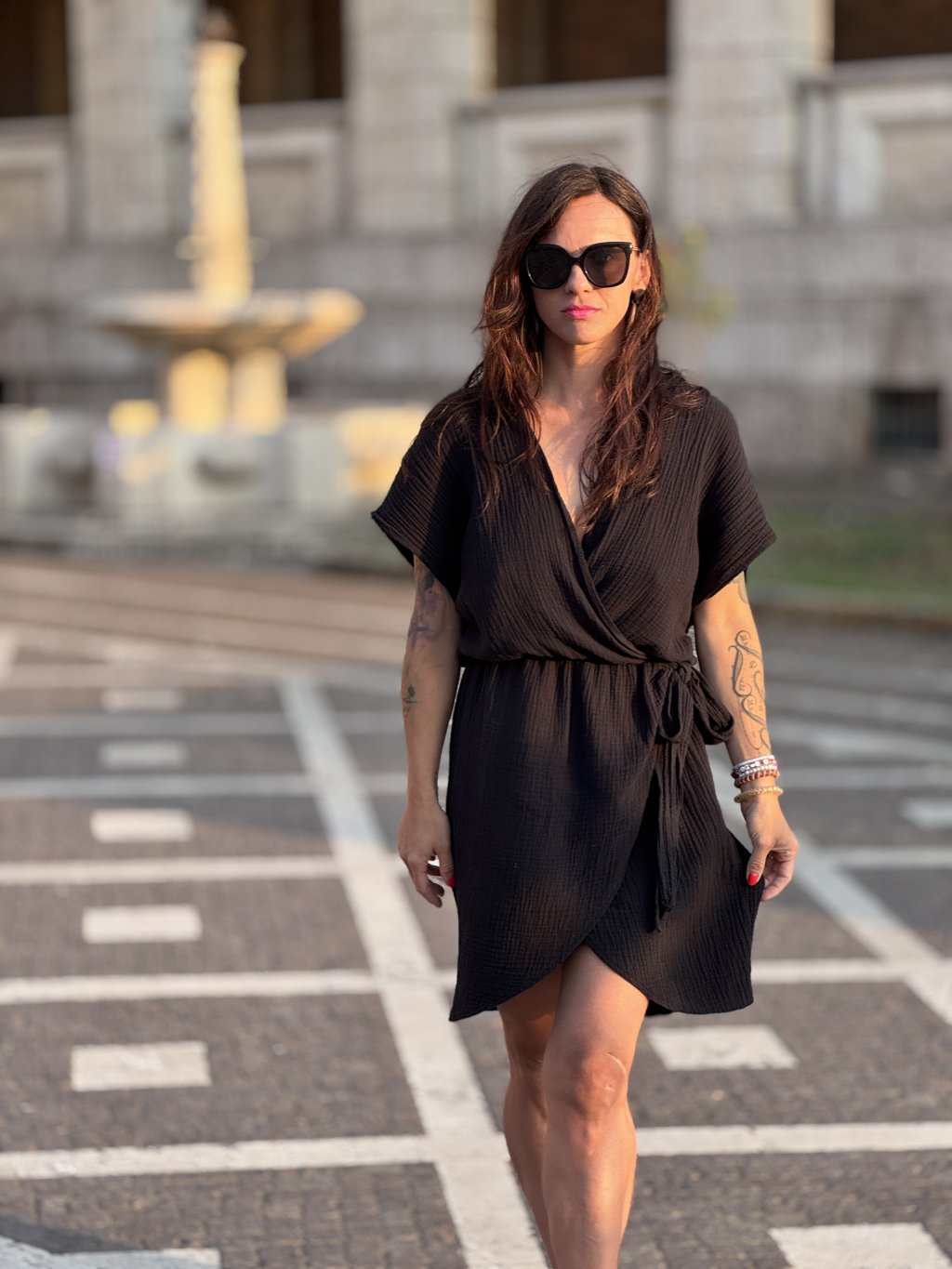 Šaty jsou ušité z prémiového černého mušelínu. V pase mají gumičku a na boku jsou na zavazování.
