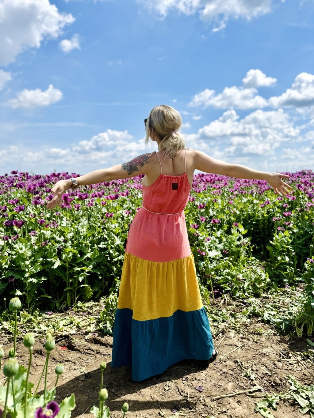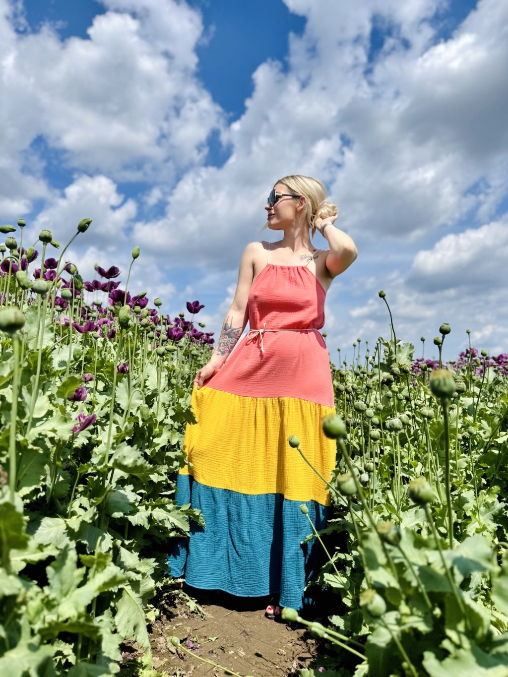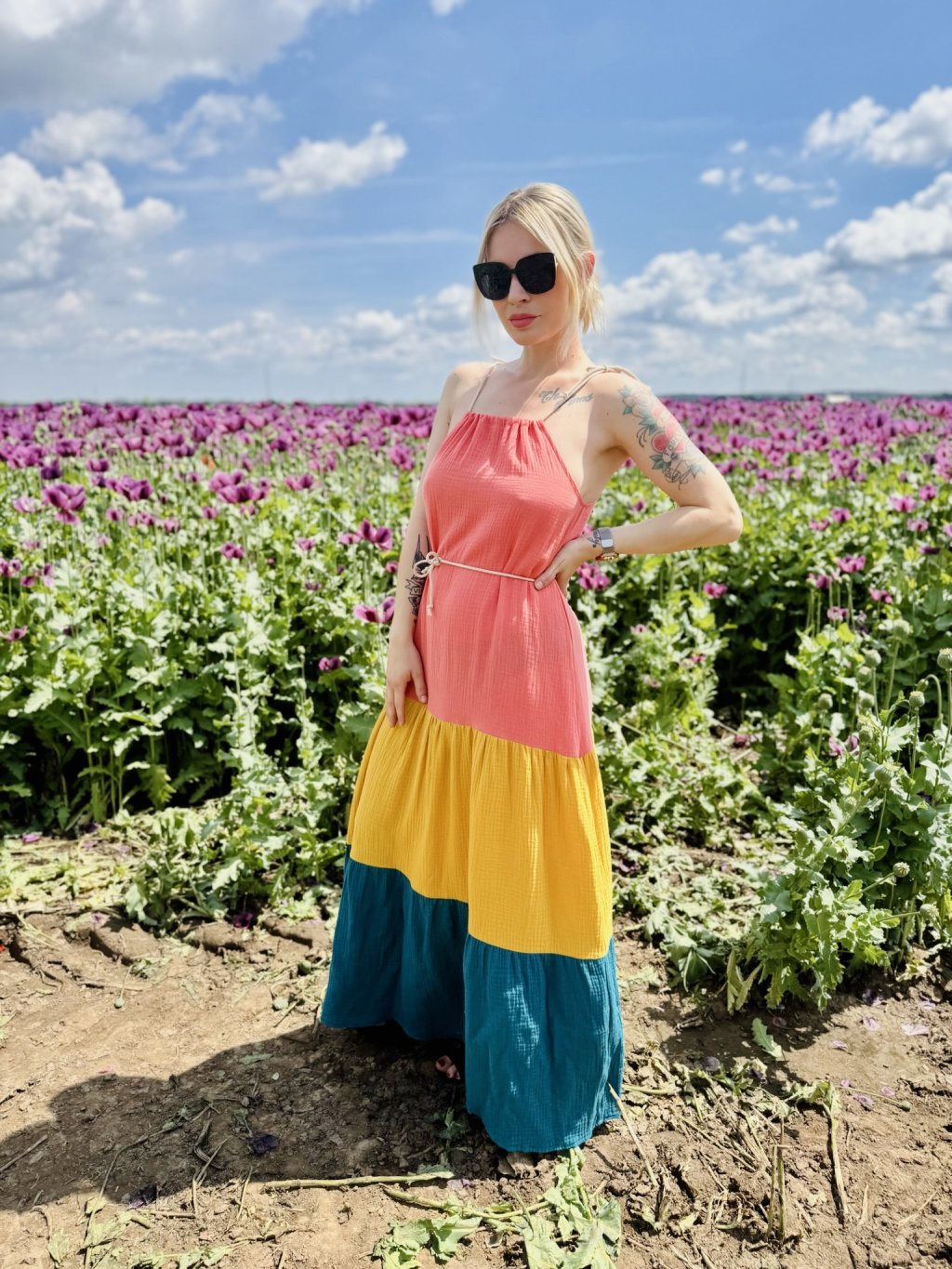 Šaty jsou volné ve střihu MAXI s nastavitelnými ramínky na zavazování, tedy budou sedět na každé postavě. Délka zakončena bohatým volanem.