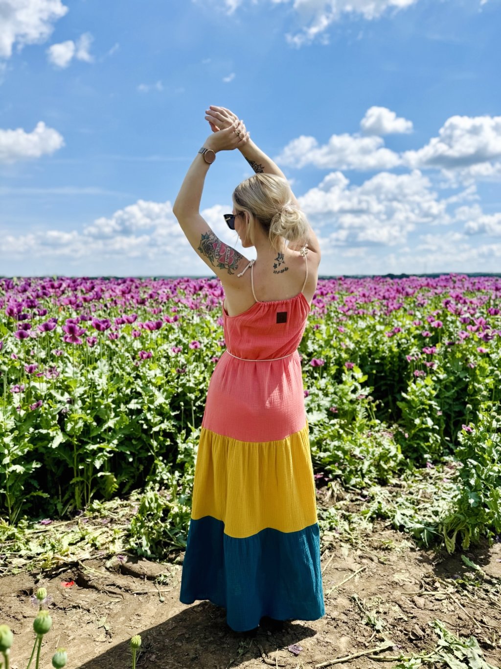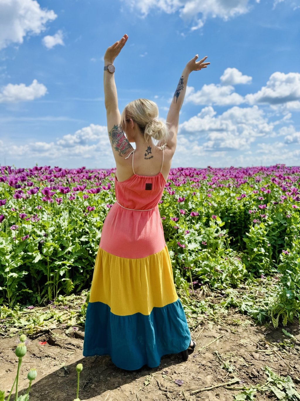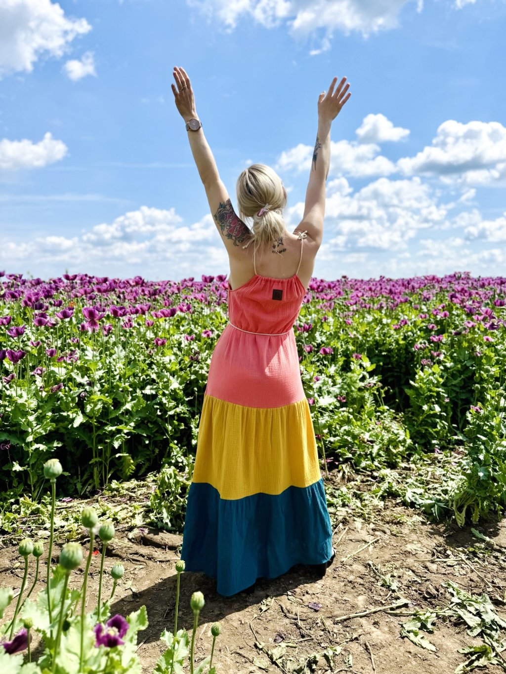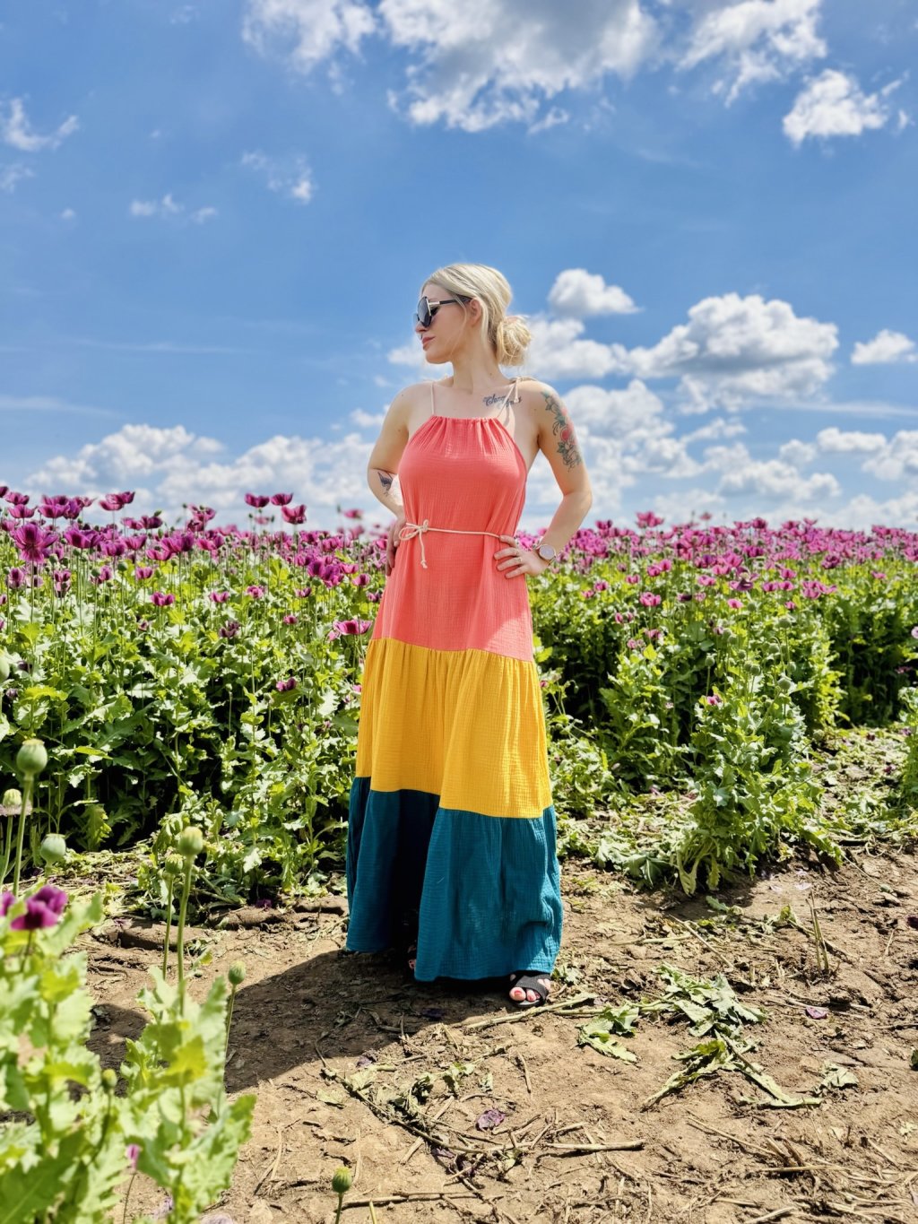 Šaty jsou volné ve střihu MAXI s nastavitelnými ramínky na zavazování, tedy budou sedět na každé postavě. Délka zakončena bohatým volanem.