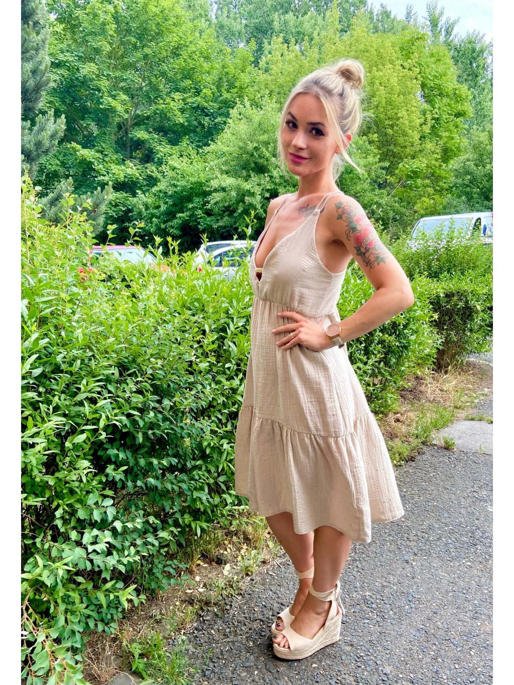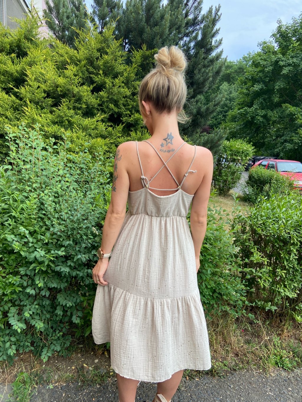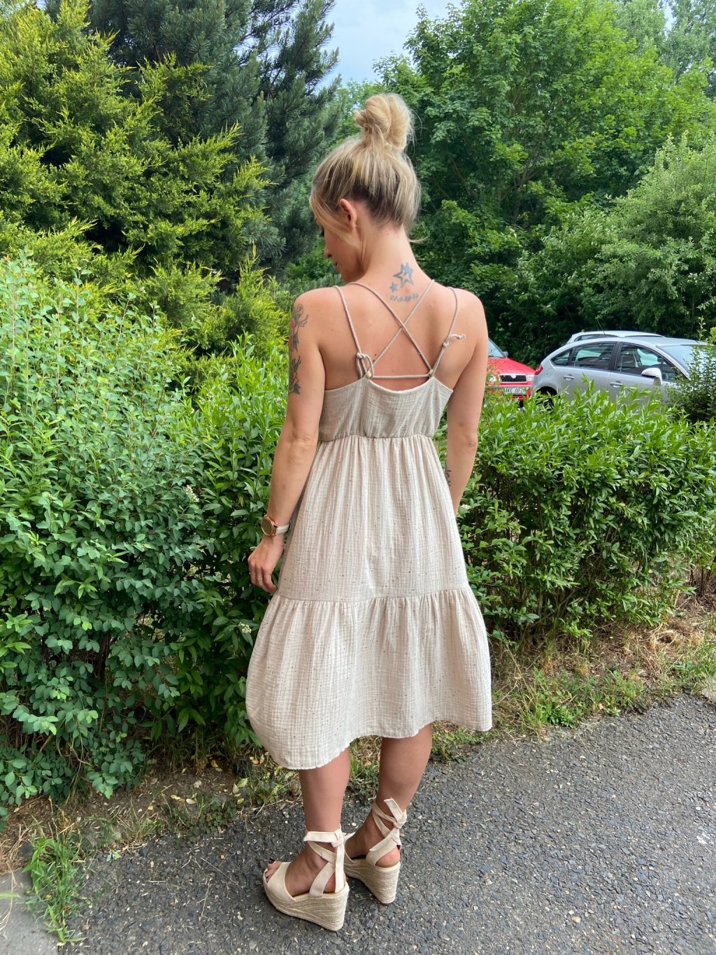 Šaty jsou ušité z prémiového béžového mušelínu se zlatými kaňkami. Přední díl je vyztužený vlizelínem, aby se daly nosit bez podprsenky. Po stranách mají záševky a pod prsy úzkou gumičku. Dva přední díly jsou spojené zlatými gumičkami. Vzadu mají rafinované zavazovaní na šňůrku, která se dá nastavit, jak potřebujete.