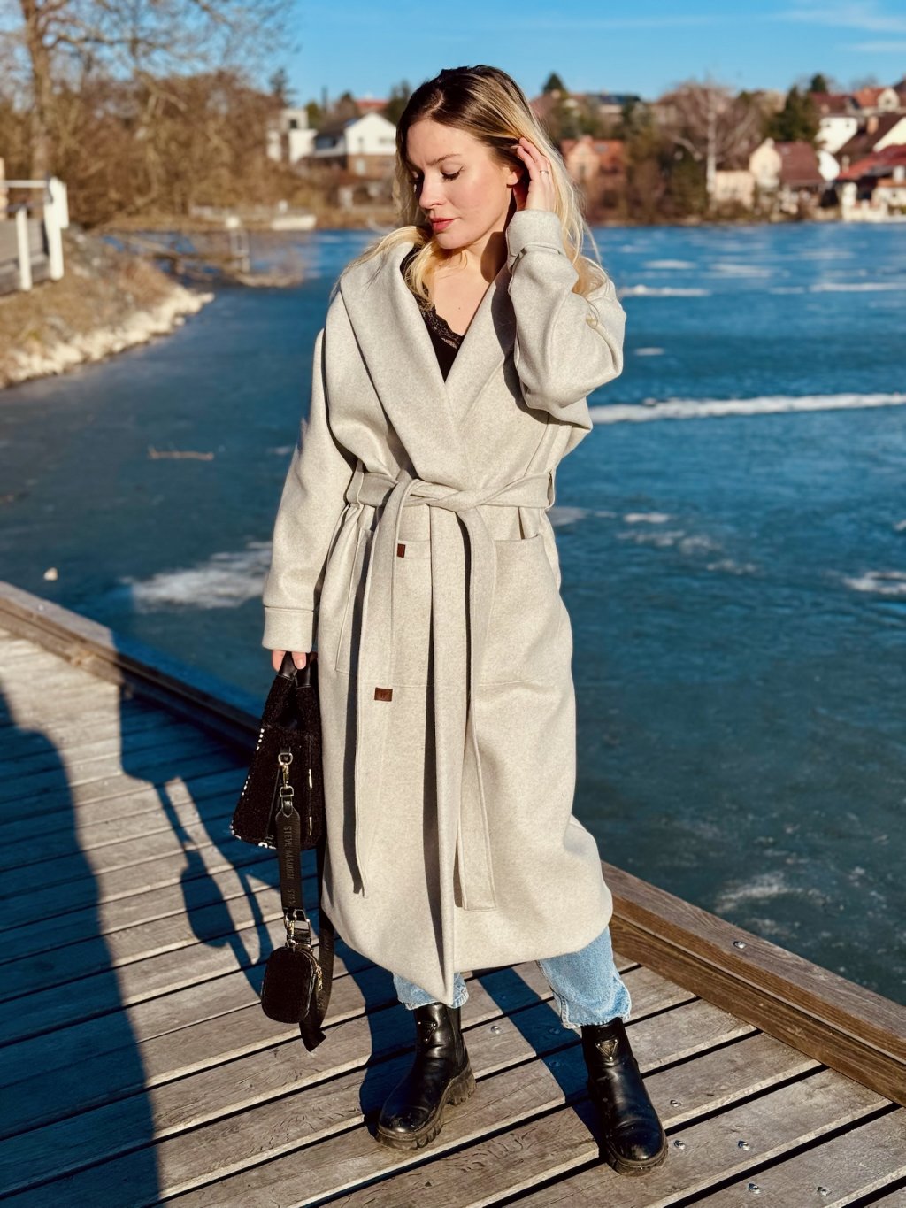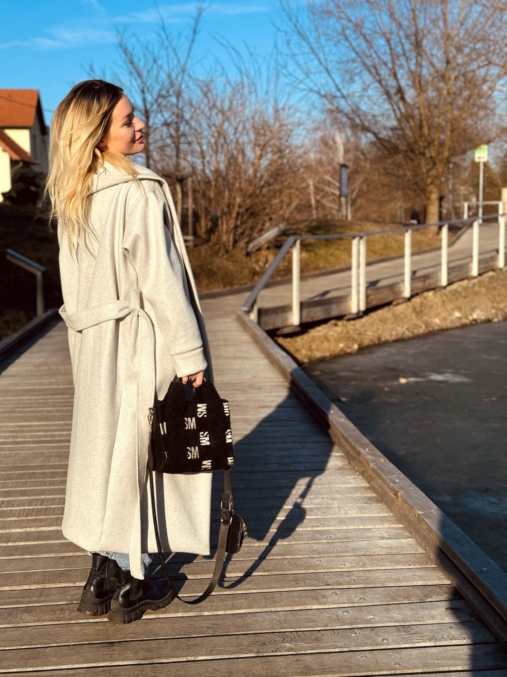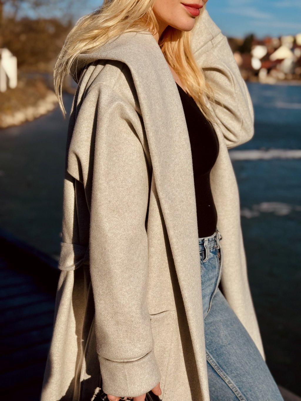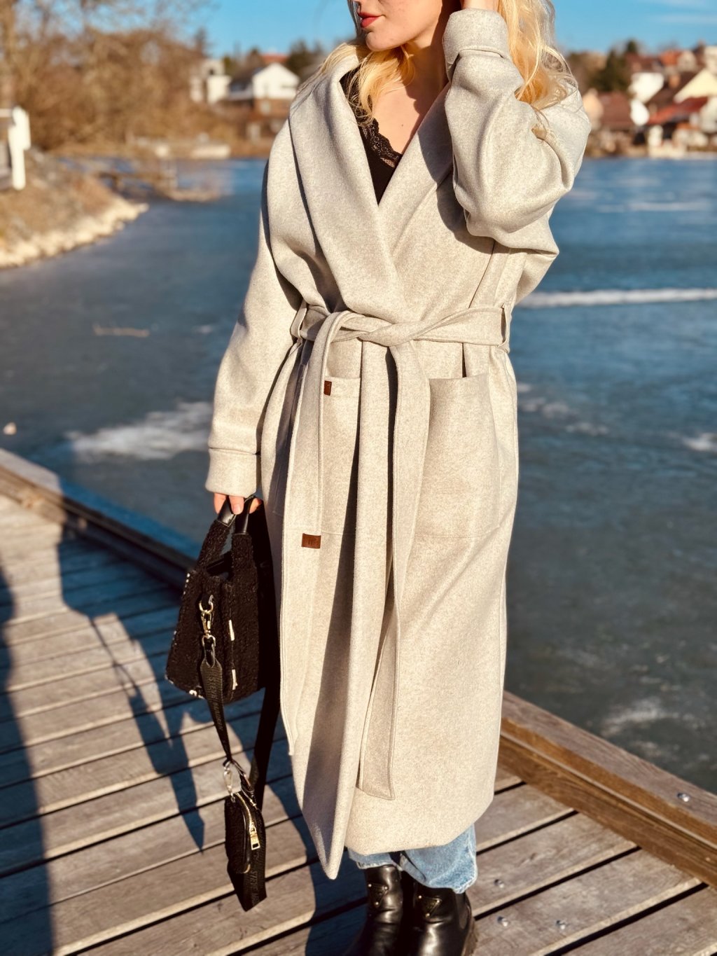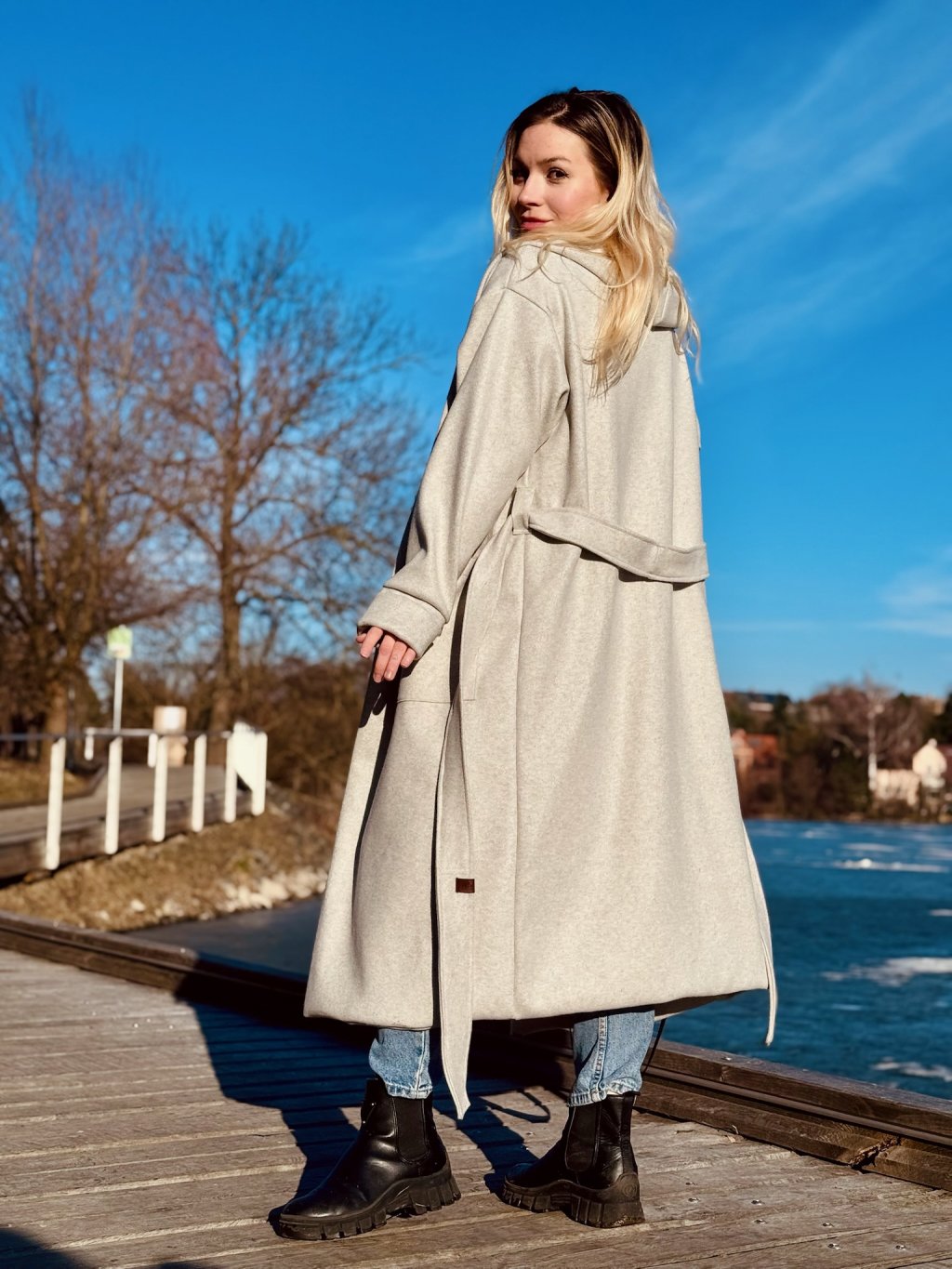 Součástí je pásek na zavázání, který umožňuje upravit siluetu podle nálady – nosit volně v oversize stylu, nebo zvýraznit pas. Praktické dvě velké kapsy podtrhují pohodlný charakter kabátu.
