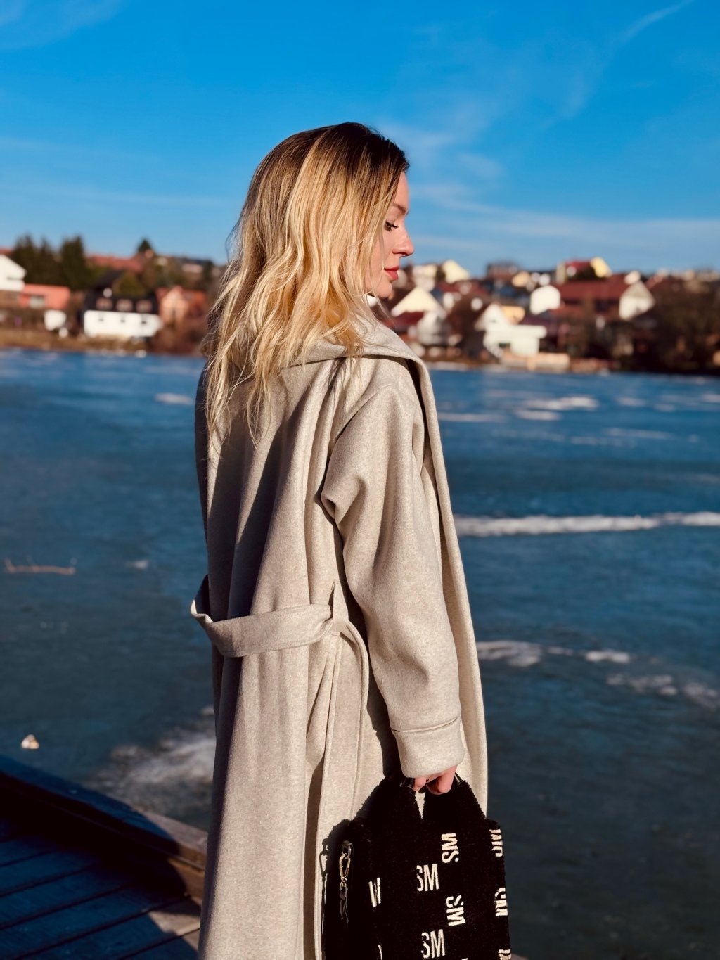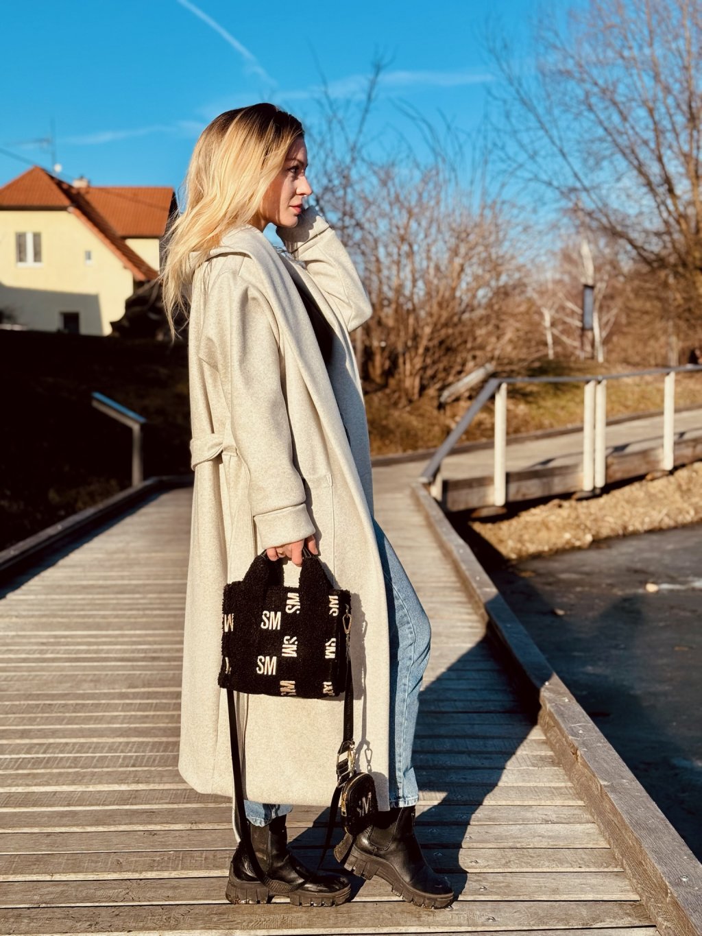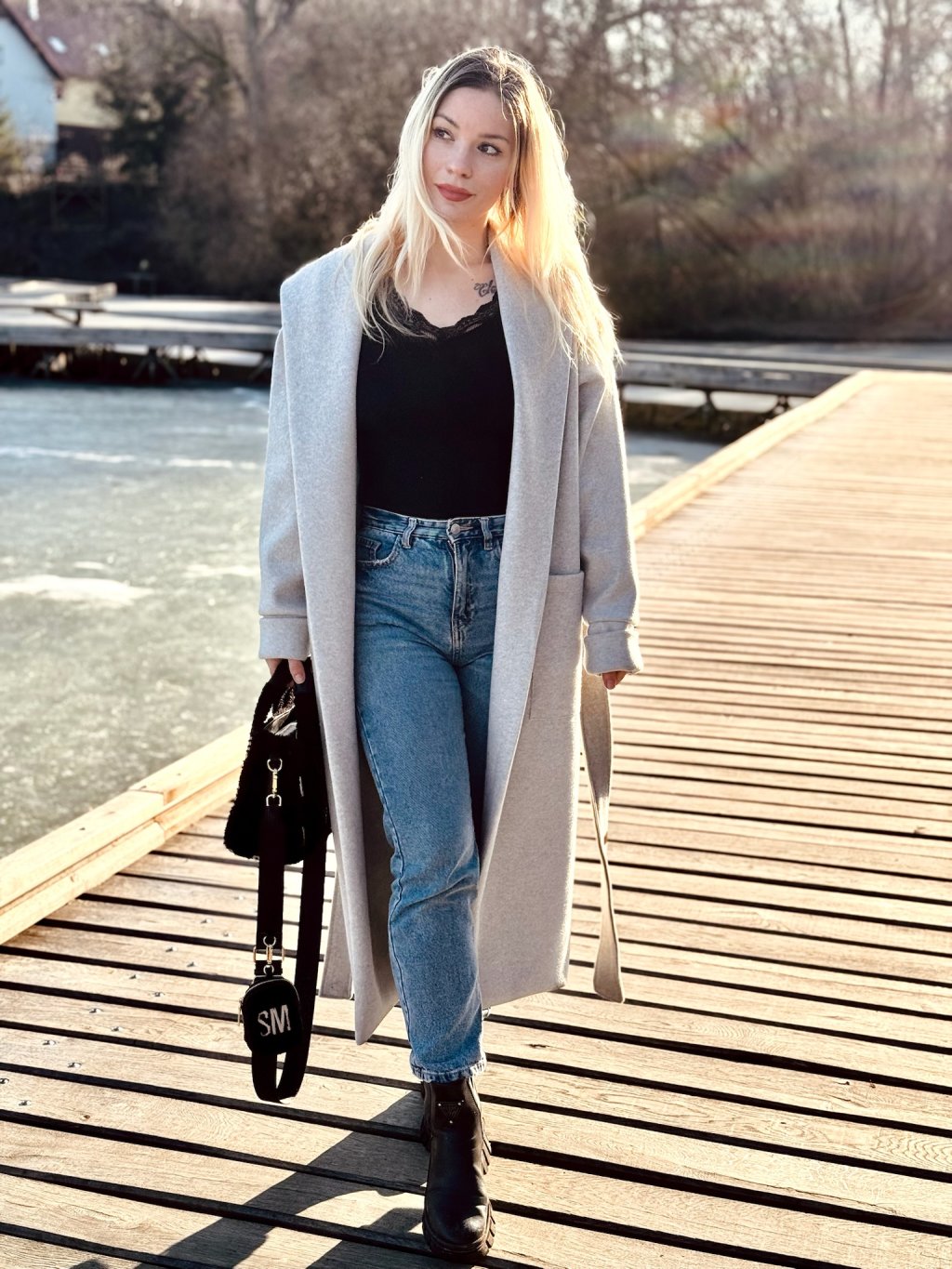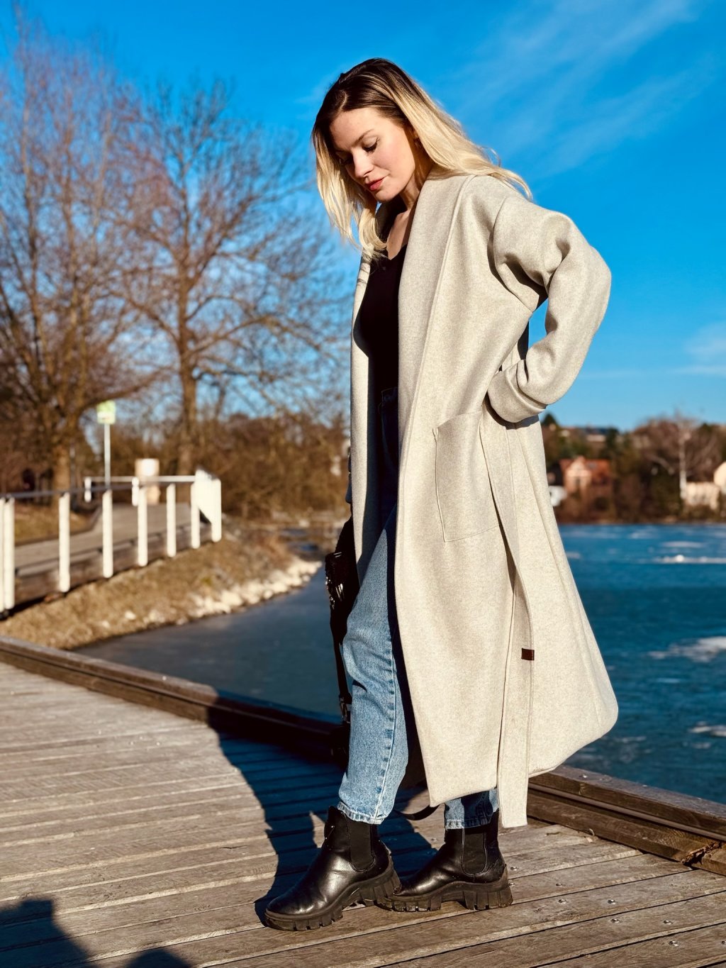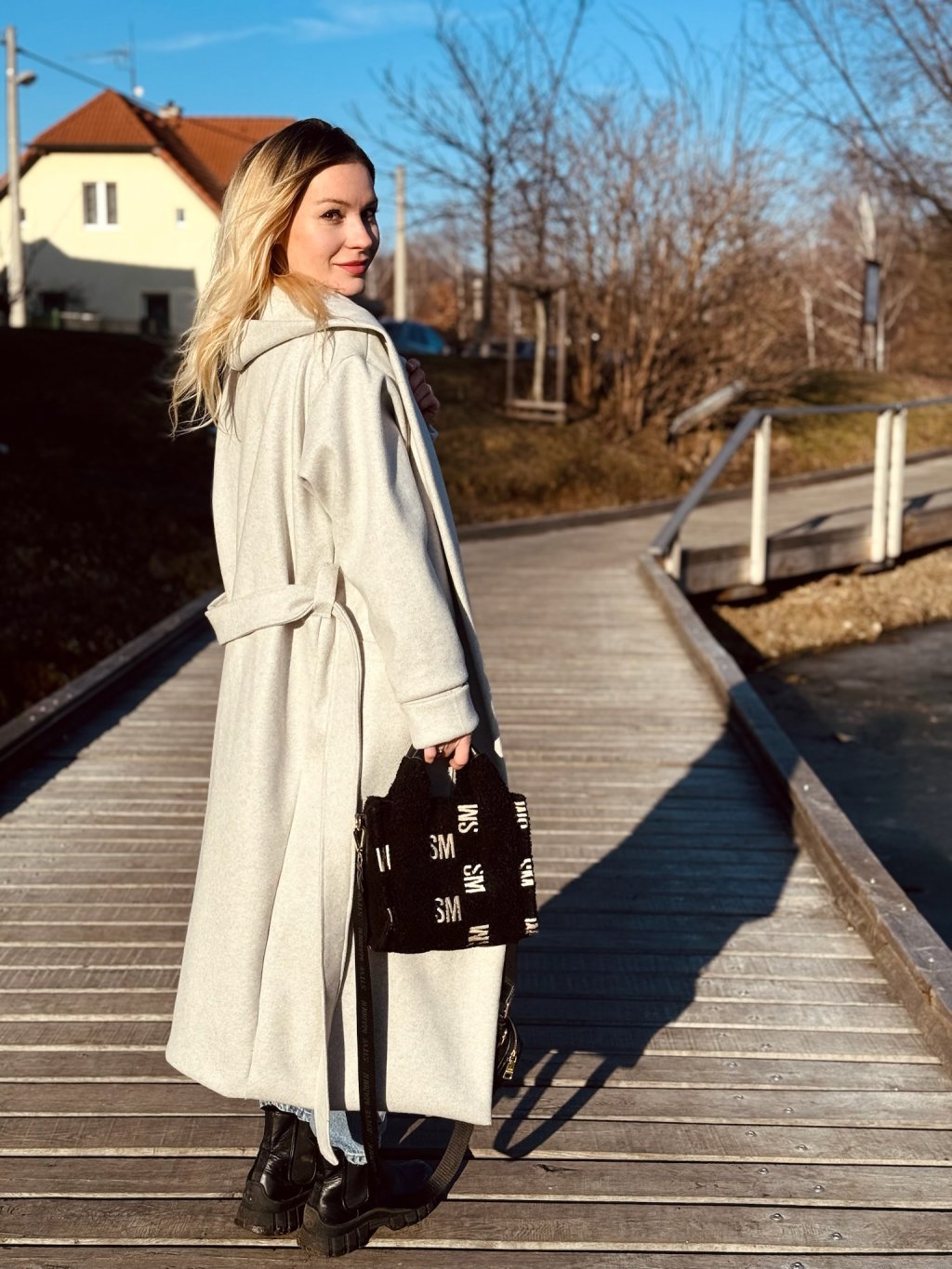Součástí je pásek na zavázání, který umožňuje upravit siluetu podle nálady – nosit volně v oversize stylu, nebo zvýraznit pas. Praktické dvě velké kapsy podtrhují pohodlný charakter kabátu.