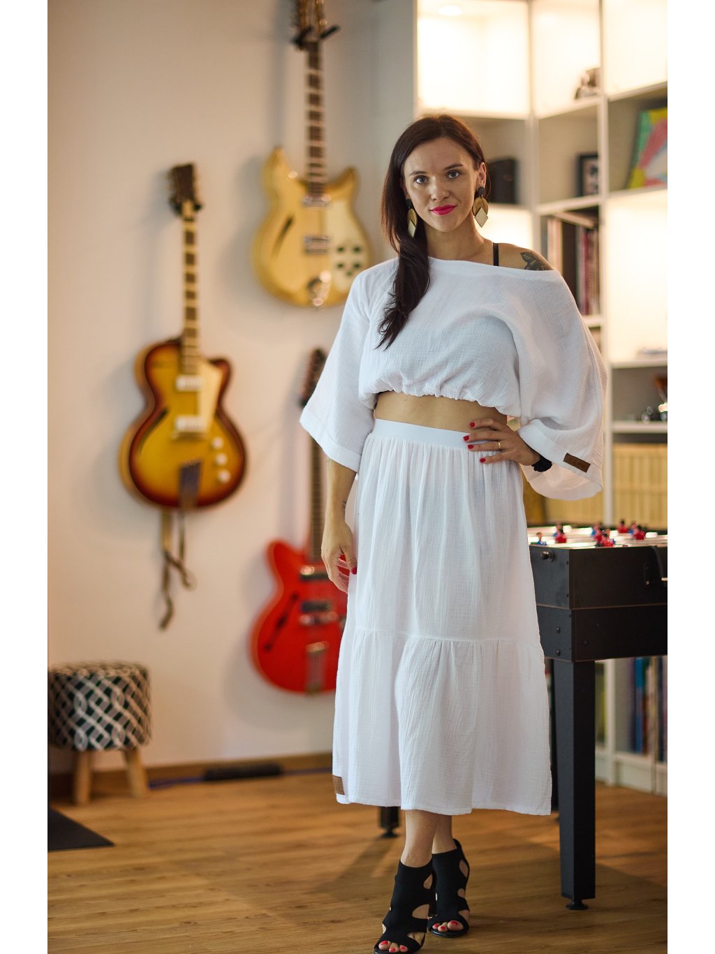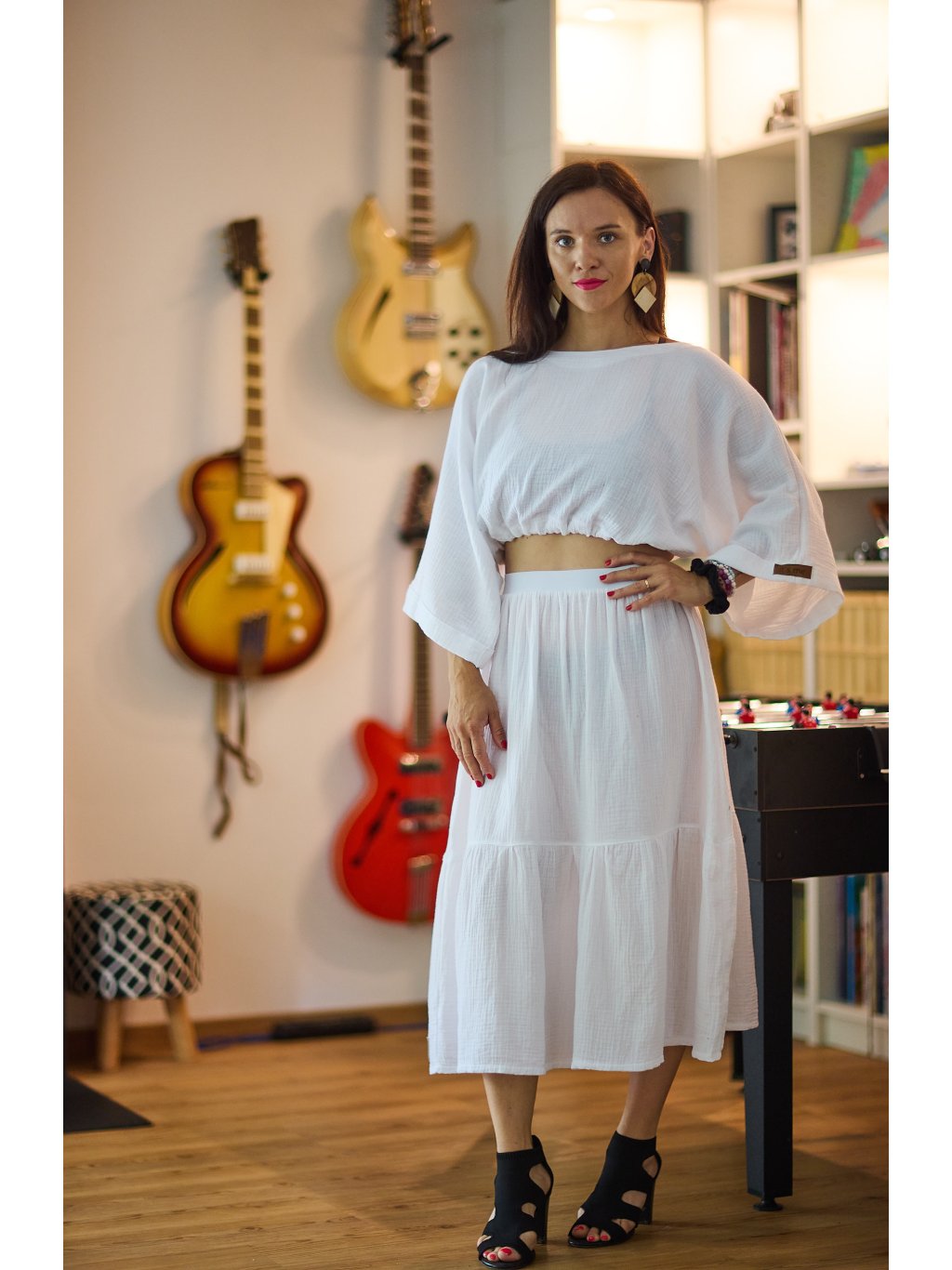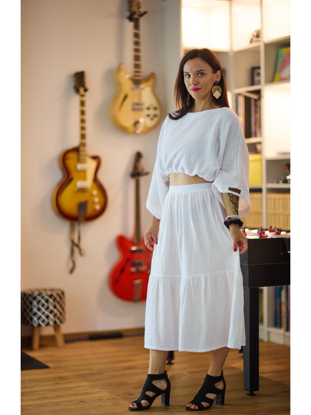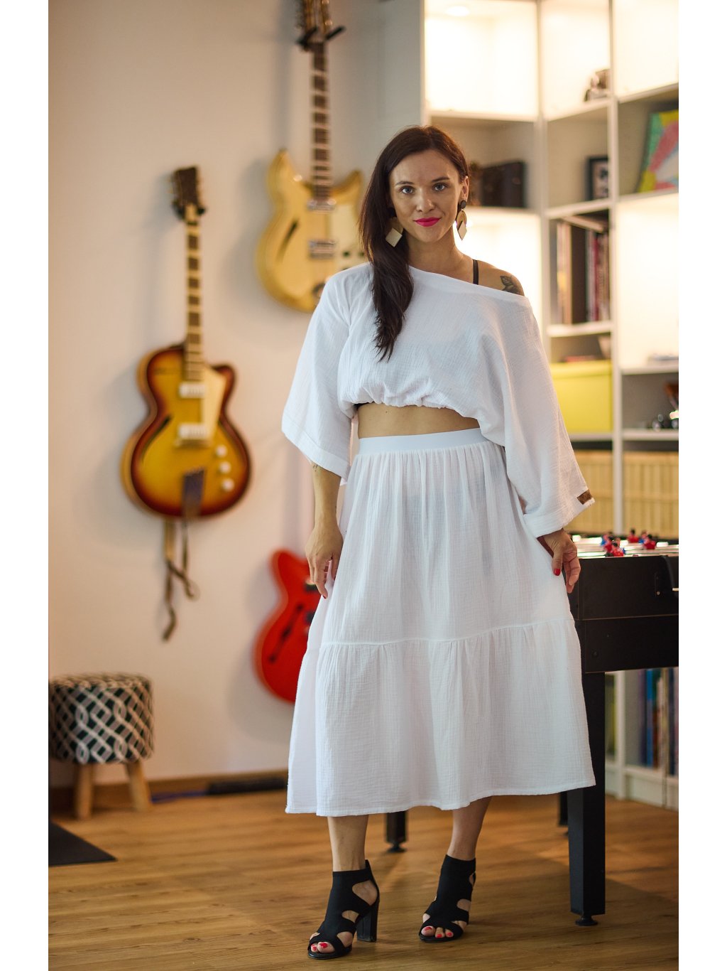 Top je ušitý z bavlněného mušelínu. V pase je nastavitelný gumičkou. Uni velikost sedí od XS do XL.