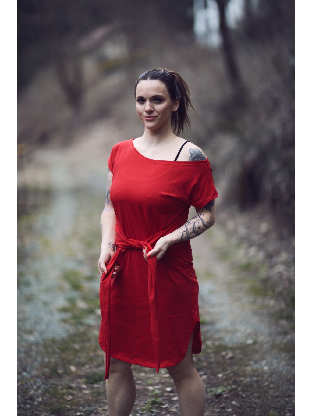 Letní volné šaty se spadlým ramenem na zavazování v pase na několik způsobů. Šaty jsou z červeného bavlna/elastan úpletu.