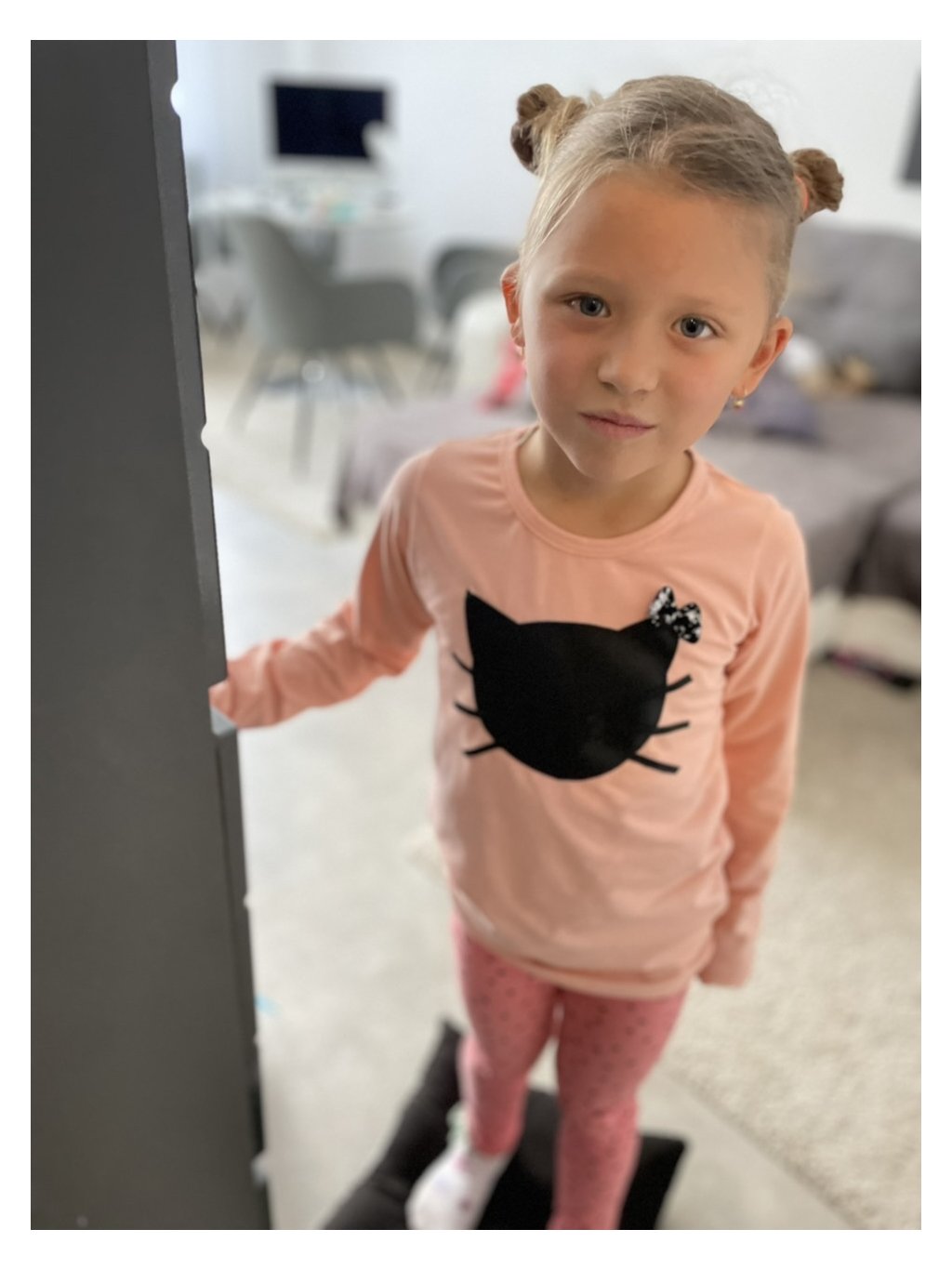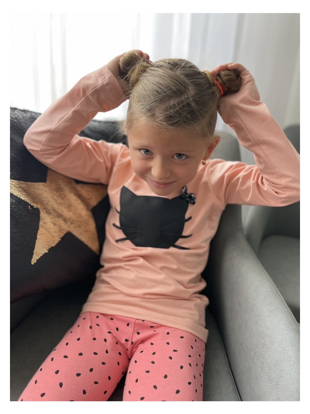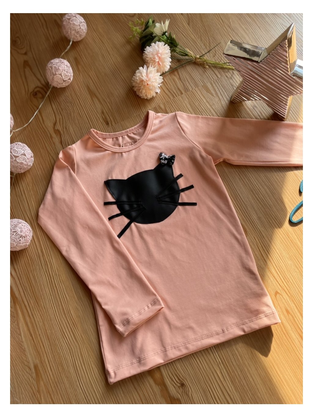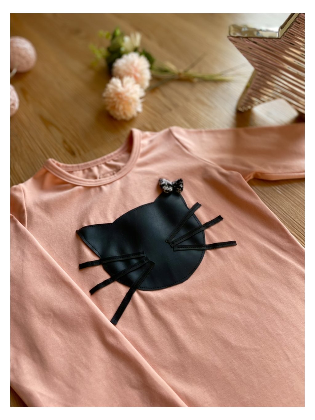 Tričko má dlouhý rukáv a na hrudníku aplikaci kočičky z černé koženky. Tričko má meruňkovou barvu.