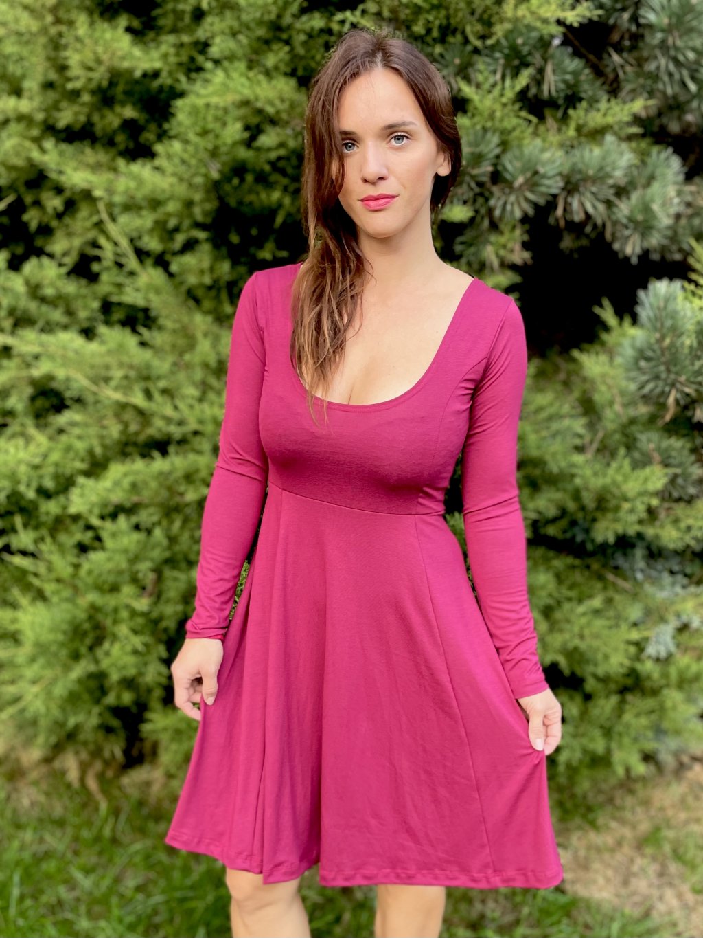 Áčkové šaty mají příjemný viskózový materiál s elastanem a jsou moc slušivé. Mají hlubší výstřih - vpředu i vzadu, na zadním díle je krajka, aby šaty nepadaly z ramen.